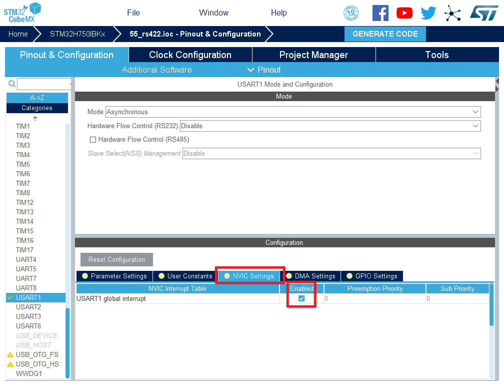 在NVIC Settings一栏使能接收中断