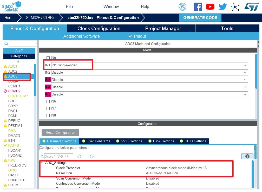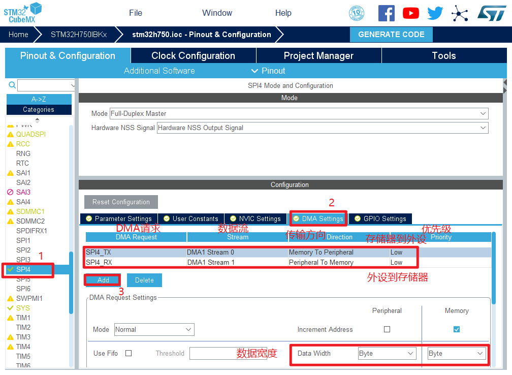 1.在主界面选择File–>New Project 或者直接点击ACCEE TO MCU SELECTOR 2.出现芯片型号选择,搜索自己芯片的型号,双击型号,或者点击Start Project进入配置 在搜索栏的下面,提供的各 种查找方式,可以选择芯片内核,型号,等等,可以帮助你查找芯片。本实验选取的芯片型号为:STM32H750IBKx。 3.配置RCC,使用外部时钟源 4.时基源选择SysTick 5.将PA10,PB7,PB8设置为GPIO_Output 6.引脚模式配置 7.配置串口 在NVIC Settings一栏使能接收中断 引脚配置 8.配置ADC 9.配置QUADSPI 10.配置SDMMC 11.配置FATFS 12.配置SPI 13.配置FMC 14.时钟源设置,选择外部高速时钟源,配置为最大主频 15.工程文件的设置, 这里就是工程的各种配置 我们只用到有限几个,其他的默认即可 IDE我们使用的是 MDK V5.27 16.点击Code Generator,进行进一步配置