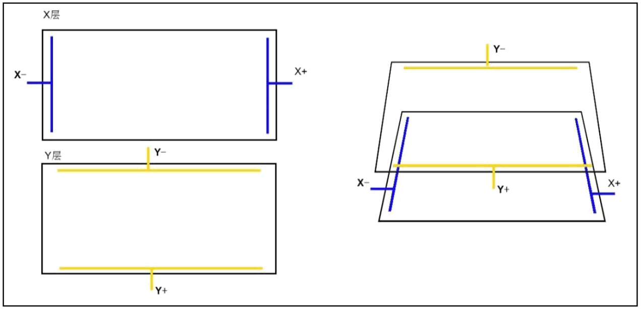 • 两个ITO涂层的两端分别引出X-、X+、Y-、Y+四个电极,见下图,这是电阻屏最常见的四线结构,通过这些电极,外部电路向这两个涂层可以施加匀强电场或检测电压。
