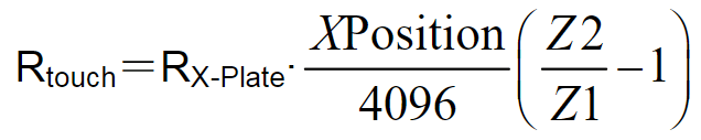 • 第一种方法需要知道X面板的电阻,X的测量位置,触摸屏面板在两个附加面板之间的测量值(Z1和Z2)。可以使用下列公式计算触摸电阻: