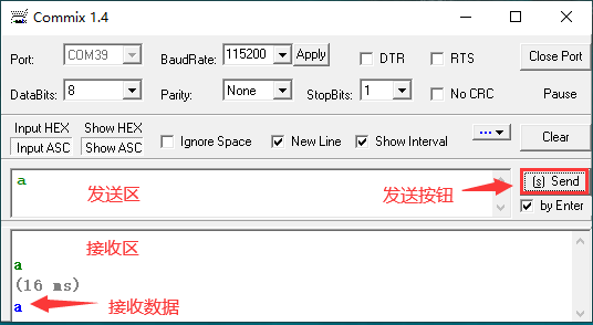 • 4、在输入去发送一个字节的数据,FPGA会自动返回该数据,如图17-5所示。