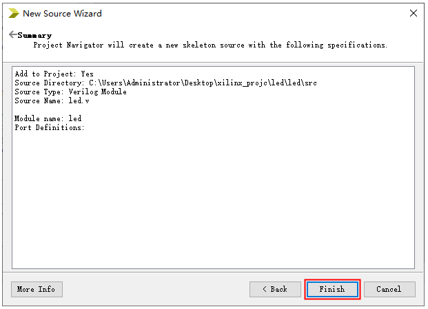 1、双击Xilinx FPGA 开发软件图标打开软件,出现下面界面,如图2.2所示,点击红框中New Project…。 图2.2 2、点击新建图标出现下面对话框,给新工程命名led,并选择好工程存放路径;顶层文件是Verilog HDL 语言编写的,因此这里将顶层文件的格式选为HDL,具体如下图所示。 图2.3 3、弹出窗口中选择对应的FPGA器件,iCore4TX双核心板的FPGA型号为Xilinx的XC6SLX16-2FTG256。则在下面界面选择FPGA器件时按照图中所示设置即可。然后点击Next。 图2.4 4、直接点击Next,弹出新建工程信息汇总,如下图,直接点击Finish。 图2.5 5、进入工程编辑界面,可以看到左边的工程文件目录区、右边的代码编辑区以及下边栏的工程信息打印区,如图2.6所示。 图2.6 6、在工程文件目录区可以看到刚刚建立的新工程led,选中led工程,右键弹出下拉栏中点击New Source,新建Verilog文件。 图2.7 7、弹出窗口中,在左侧栏中选中Verilog Module,并将Verilog 文件命名为led;文件命名栏下面是新建文件的保存路径。这里选择保存路径时可以在工程文件夹下新建一个src文件夹,专门用于存储Verilog Source 文件。各项都设置好以后,点击Next。 图2.8 8、弹出窗口中设置led模块的端口信号,这里点击Next。 图2.9 9、弹出窗口是新建的源文件led.v的信息提示,点击Finish。 图2.10 10、在主界面可以看到左边工程目录区多了led模块文件,右边代码编辑区是软件自动生成的模块信息。如下图所示。 图2.11 11、向led 模块module led中添加工程代码,通常一个完整的模块由module和endmodule为开始和结尾,除此外还包括模块名、端口变量及类型的定义、硬件语言描述、内部变量定义等信息,如此组成一个完整的功能模块,如图2.12所示。 图2.12 12、程序编写完成后进行编译,检查语法错误;首先在工程目录文件区选中顶层模块led,然后在工程目录区下边的Design栏,找到Synthesize – XST,右键点击Run,如图2.13所示。 图2.13 13、编译通过会在Synthesize – XST前面出现一个对号,表示没有语法错误。同时在工程编辑区会显示编译信息,如寄存器和逻辑门等的资源消耗情况。
