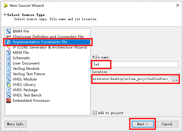 14、接下来是给模块端口列表里的输入输出信号分配引脚,采用ucf文件绑定引脚信息。首先在工程文件目录区右键选择New Source … 选项。弹出窗口中,文件格式选择Implementation Constraints File选项,左边分别输入文件名和保存路径,点击Next。 图2.14 15、弹出的窗口直接点击Finish,完成引脚分配文件led.ucf文件的建立。在右边编辑区输入引脚绑定信息,格式为: