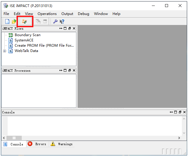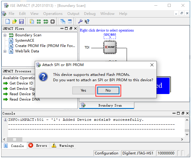 1、首先将下载器连接到iCore4TX核心板的JTAG接口,和MicroUSB 线连接到连接到iCore4TX 的核心板上,并给板子供电。 图2.17 2、本例程采用iMPACT的下载方式。点击Configure Target Device 前面的“+”,然后选中“Manage Configuration Project(iMPACT)”,双击运行或者右键单击Run。如图所示。 图2.18 3、然后在弹出窗口中点击左上角的Launch Wizard。 图2.19 4、出现如下界面,直接点击OK,默认选择JTAG。 图2.20 5、弹出提示中点击Yes,添加“.bit”文件。 图2.21 6、在弹出的文件路径窗口中,找到前面生成的“.bit”文件,选中后点击Open。 图2.22 7、此窗口中点击OK。 图2.23 8、弹出的对话框中选择No。 图2.24 9、返回到ISE的iMPACT界面;选中芯片图标,单击右键选择Program; 图2.25 10、弹出的提示窗口中单击OK,如果一切正常下载成功,iMPACT界面会出现蓝色的Program Succeeded提示字样。表明程序已经下载至FPGA。此时可以观察到FPGA_LED闪烁。