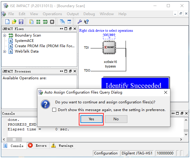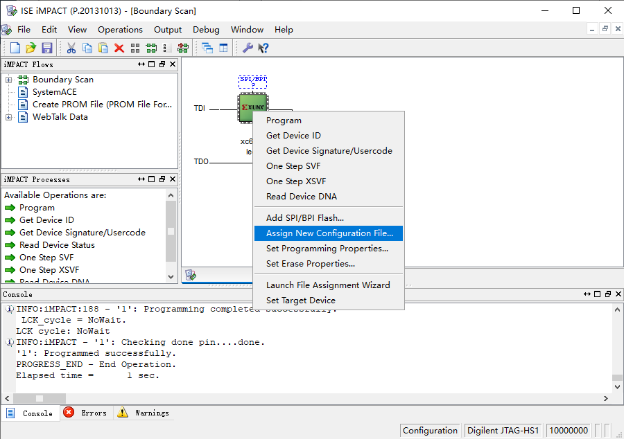 添加“.bit”文件时,还可以在iMPACT界面,点击芯片图标,右键选择Assign New Configuration File…。后面的操作步骤不变。 图2.26