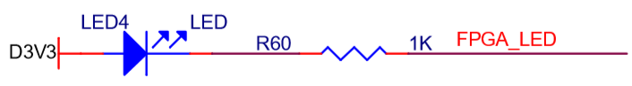 • led的驱动原理是通过程序,控制FPGA引脚IO的电平,从而实现对led的控制。led的硬件原理图如图2.1所示。从图中可以看出,led正极接3.3V电平,负极接到FPGA的引脚上。当FPGA_LED引脚为高电平时LED灭,为低电平时LED亮。