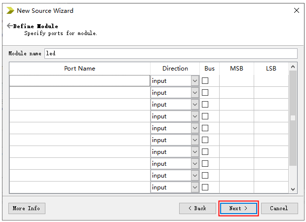8、弹出窗口中设置led模块的端口信号,这里点击Next。