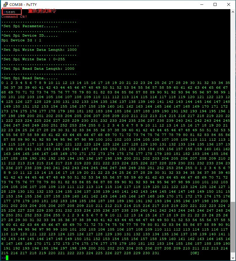4. 将编写好的ARM代码编译,并下载到开发板中,putty工具中会打印相应的SPI通信相关信息(若想多次测试,查看结果在putty中输入“test”即可);
