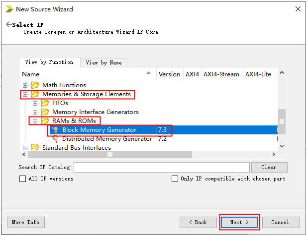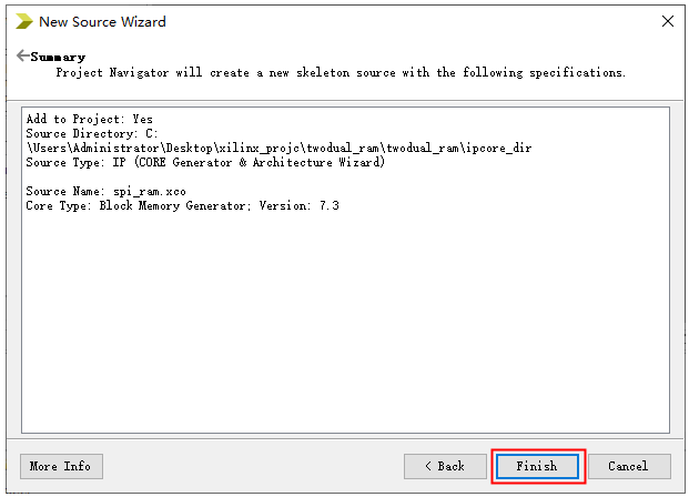 1、 新建一个工程名为twodual_ram的工程。 图21-2 2、 在工程目录栏选中工程,右键单击,点击New Source…。 图21-3 3、 弹出界面的左侧栏选中IP(CORE Generator & Architecture Wizard)选项,并在右侧File name栏输入新建IP核的文件名,然后点击Next。 图21-4 4、 弹出Select IP界面如下图所示,在Memories & Storage Elements 栏下找到RAM & ROM,点击前面的“+”展开,单击选中Block Memory Generator,然后点击Next 进入下一步。 图21-5 5、 直接点击Finished。 图21-6 6、 然后弹出RAM IP 核相关信息设置的界面,这里的Interface Type选项保持默认设置Native即可,然后点击Next,如下图所示: 图21-7 7、 在Memory Type 栏选择RAM类型,本实验是双口RAM实验,所以这里选择True Dual Port RAM,然后点击Next。 图21-8 8、 设置RAM的位宽为8,存储深度为1024,Port A Options和Port B Options参数勾选如下图红框中所示,然后点击Next。 图21-9 9、 此界面保持默认选项,直接点击Next。 图21-10 10、 此界面也是默认选项,点击Next。 图21-11 11、 保持默认,点击Generate。可以在工程目录栏中看到spi_ram IP核文件已经添加完成。 图21-12