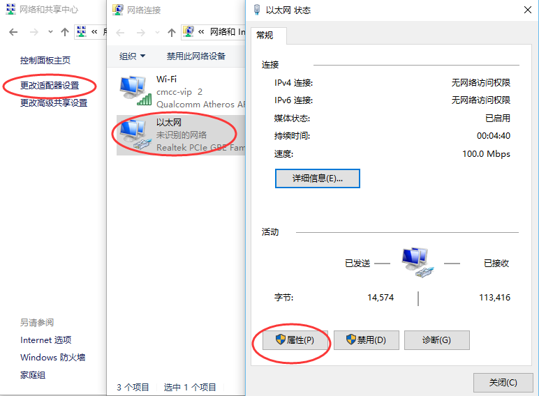 1、打开控制面板—→网络和Internet—→网络和共享中心—→更改适配器设置—→以太网—→属性。