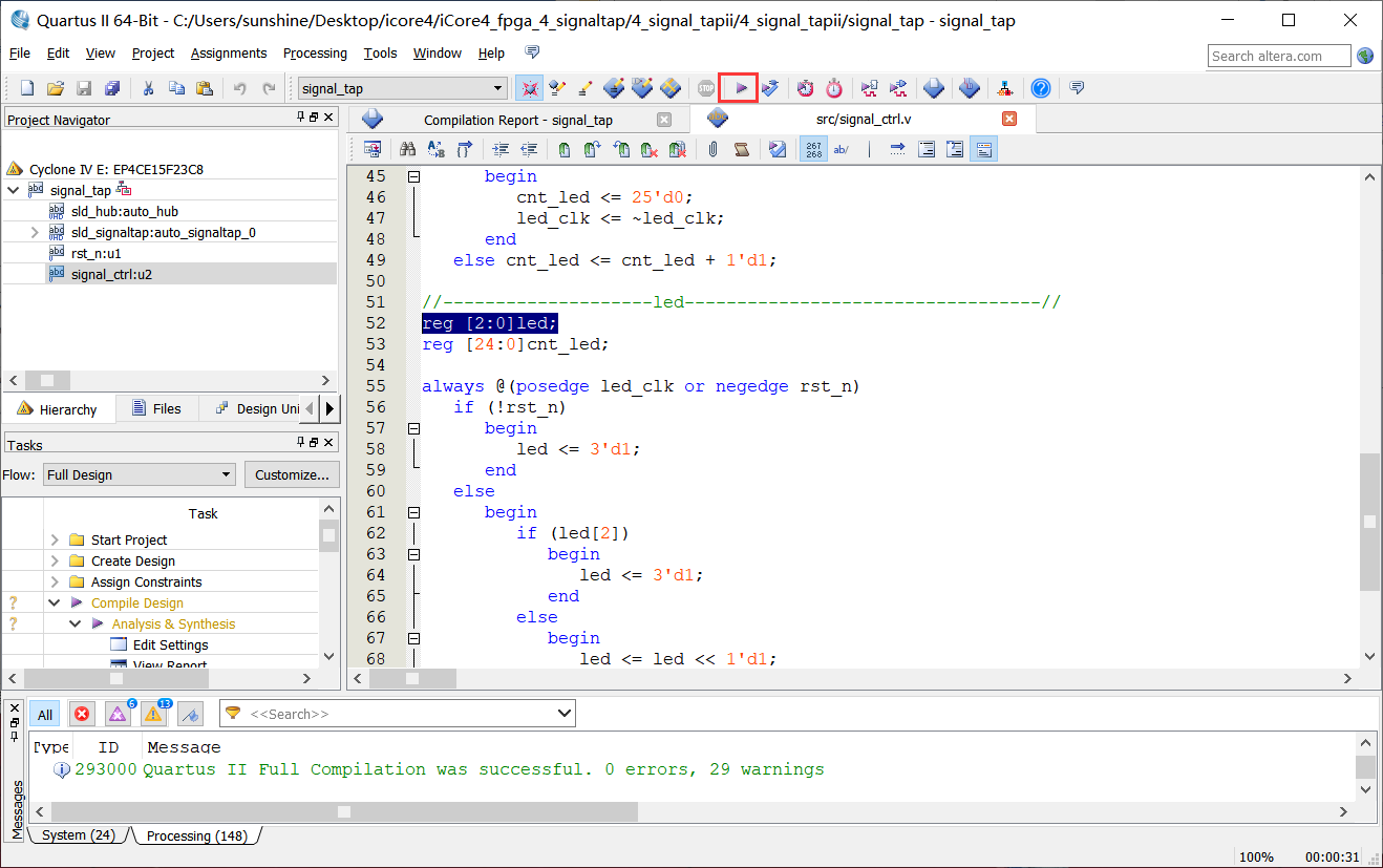 12、回到Quartus主界面,保存工程并重新编译,如图4-12所示。