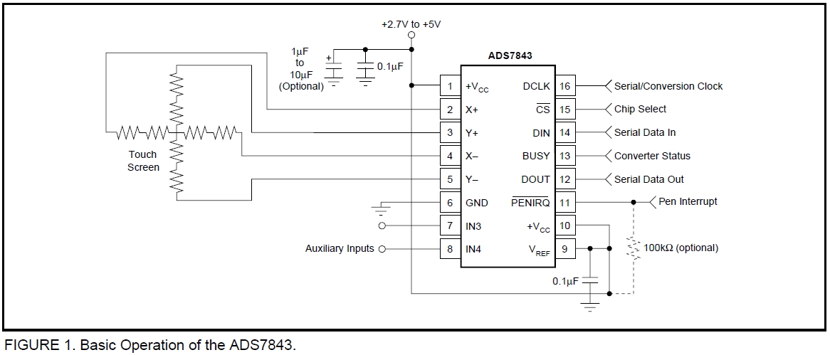 • 下图是AD转换芯片ads7843的典型应用电路,从图中也可以看出触摸屏作为等效电阻网络,通过四线连接到ads7843芯片的X+、X-、Y+、Y- 等引脚。经AD芯片转换后发送给FP GA或者ARM处理,从而判断触摸点的位置。