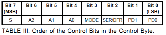 • 这里DIN_x和DIN_y对应的指令值在ADS7843的手册中可以查到,是要配置到AD转换芯片的寄存器的值。DIN_x和DIN_y是X方向和Y方向转换时需要分别输入到AD寄存器的值。S位表示数据传输起始,必须置1。A2、A1、A0组合进行通道X或通道Y的选择。MODE是精度选择位,这里我们用的是12位输出,MODE位置0。SER/DFR表示参考电压的输入模式,这里选择的是0,即差动输入模式,PD1和PD0是省电模式的选择,00代表在两次AD转换之间掉电。如此,明白DIN_x和DIN_y被赋的值所代表的含义了吧?