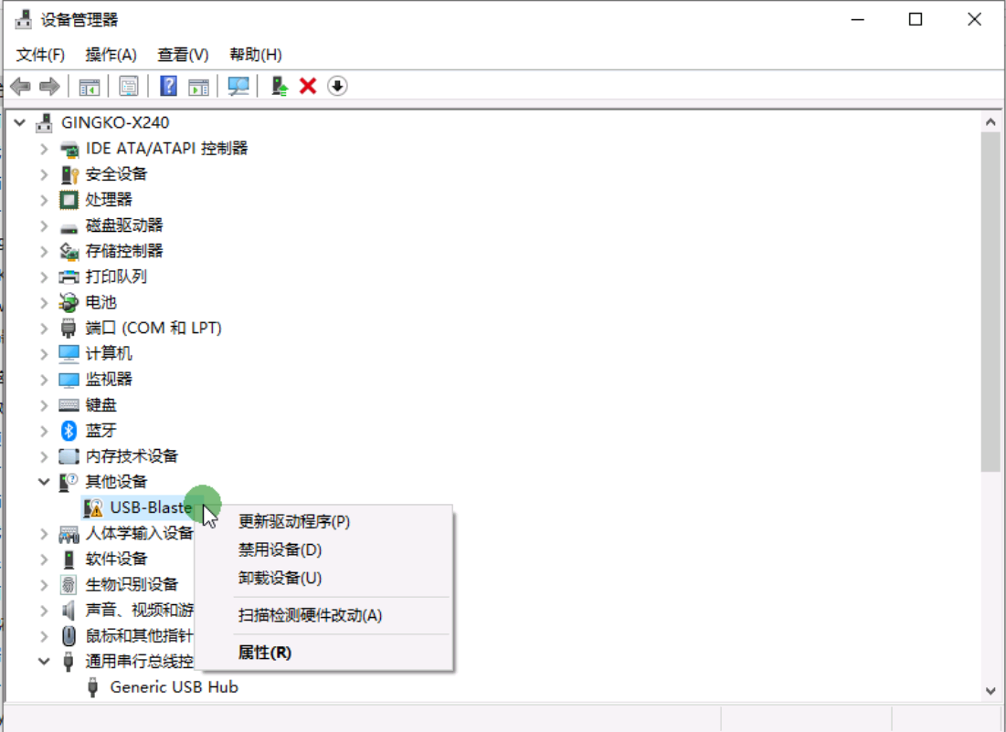 1、将iTool3/Pro通过USB方口线与电脑连接,进入电脑的设备管理器,在其他设备中找到USB-Blaster。 2、鼠标右键USB-Blaster,选择更新驱动程序。 3、选择浏览我的计算机以查找驱动程序软件。 4、找到驱动所在的文件夹,选择USB-Blaster文件夹后确认(注意:将目录指向USB-Blaster文件夹即可,不要继续选择下一级文件夹,否则会导致安装出错)。 5、选择完成点击下一步进行安装。 6、等待驱动安装完成。 7、安装完成后点击关闭,可在设备管理器中看到已经正常的驱动。