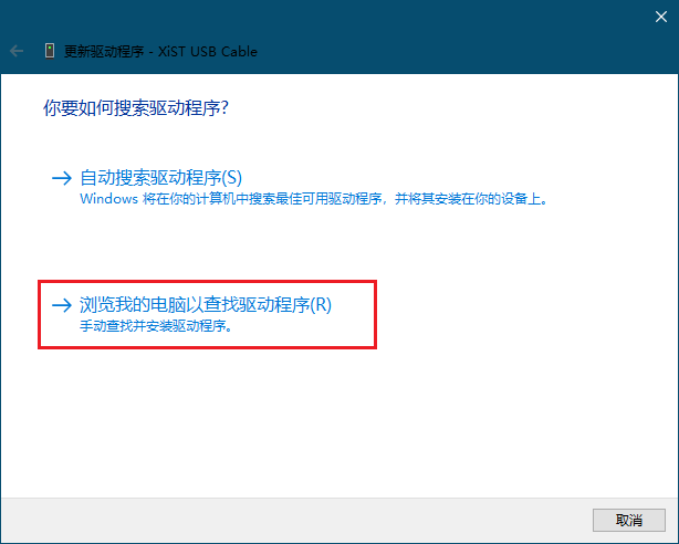 2、在windows设备管理器里找到XiST USB Cable设备,位于其他设备分类下,带黄色惊叹号 3、右键XiST USB Cable,选择更新驱动程序。 4、选择浏览我的电脑以查找驱动程序。 5、浏览文件夹,定位到HqFPGA软件存放位置下的drivers文件夹,如笔者的为:G:\hq_2.14.2_061923_win64\driver,点击下一页。 6、安装完成显示如下。 7、安装驱动成功后,在设备管理器中如下图所示。 8、安装结束,可以使用了。